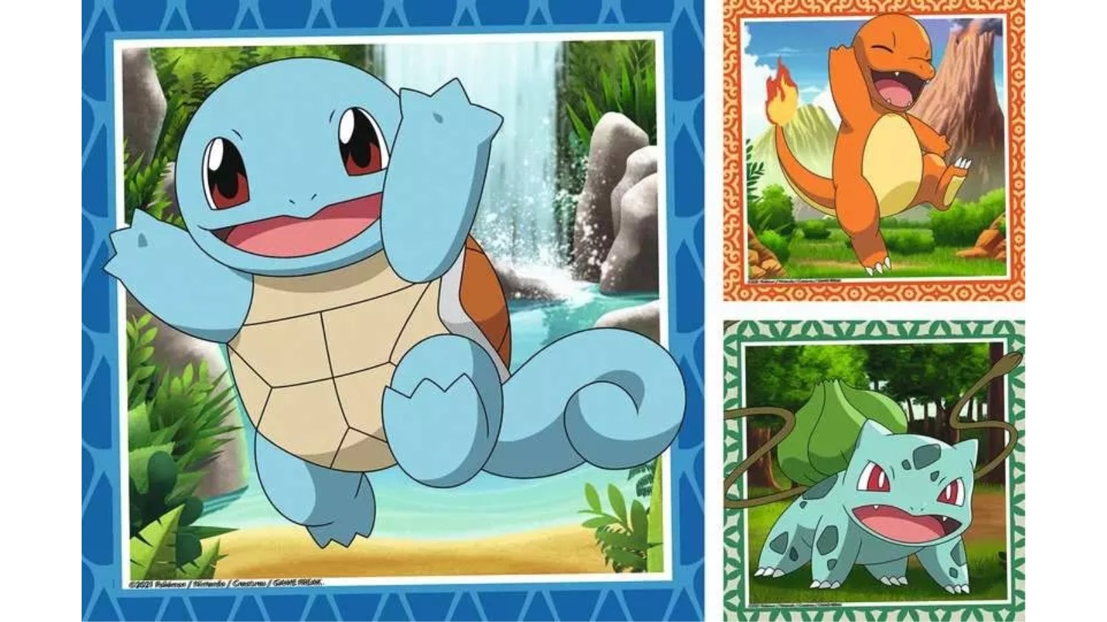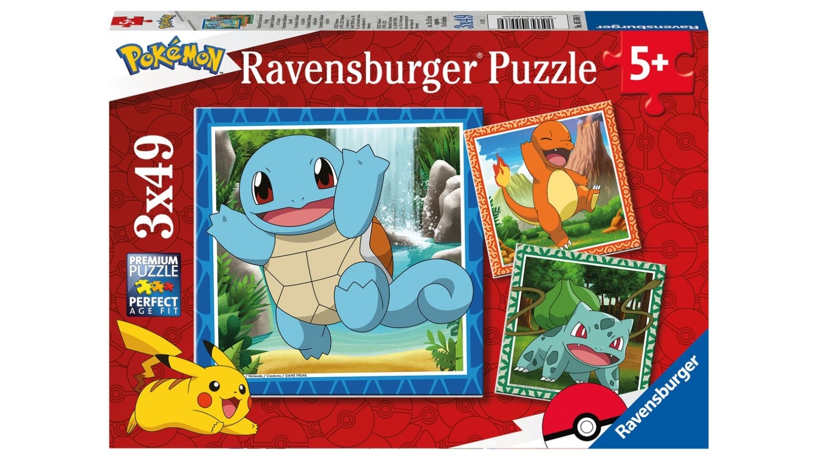 שלושה פאזלים צבעוניים ובהירים בני 49 חלקים כל אחד, רעיון מתנה נהדר ומפתח לילדות וילדים בגיל 5 ומעלה שרוצים לתפוס את כולם! הפאזלים מציגים דמויות אהובות במיוחד עם רקעים המתאימים לסוג שלהם: בלבזאור (Bulbasaur) על רקע של צמחייה, סקווירטל (Squirtle) על רקע מפל מים וצ’רמנדר (Charmander) על רקע הר געש.