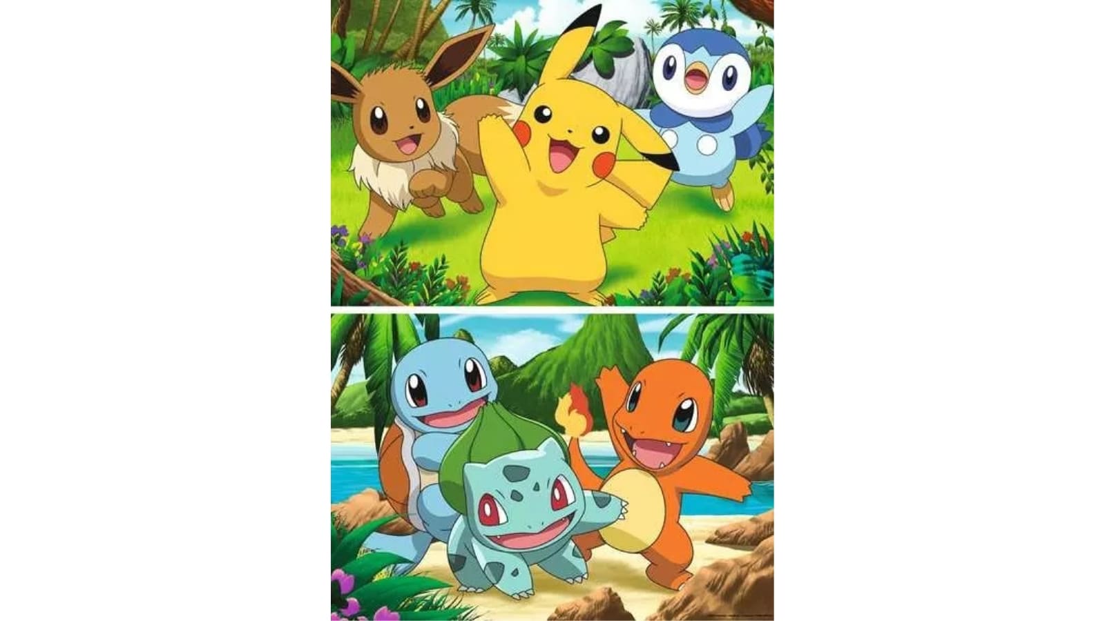 שני פאזלים צבעוניים ובהירים בני 24 חלקים כל אחד, רעיון מתנה נהדר ומפתח לילדות וילדים בגיל 4 ומעלה שרוצים לתפוס את כולם! הפאזלים מציגים דמויות אהובות במיוחד: פיקאצ’ו (Pikachu), איווי (Eevee), בלבזאור (Bulbasaur), סקווירטל (Squirtle), צ’רמנדר (Charmander) ופיפלאפ (Piplup).
