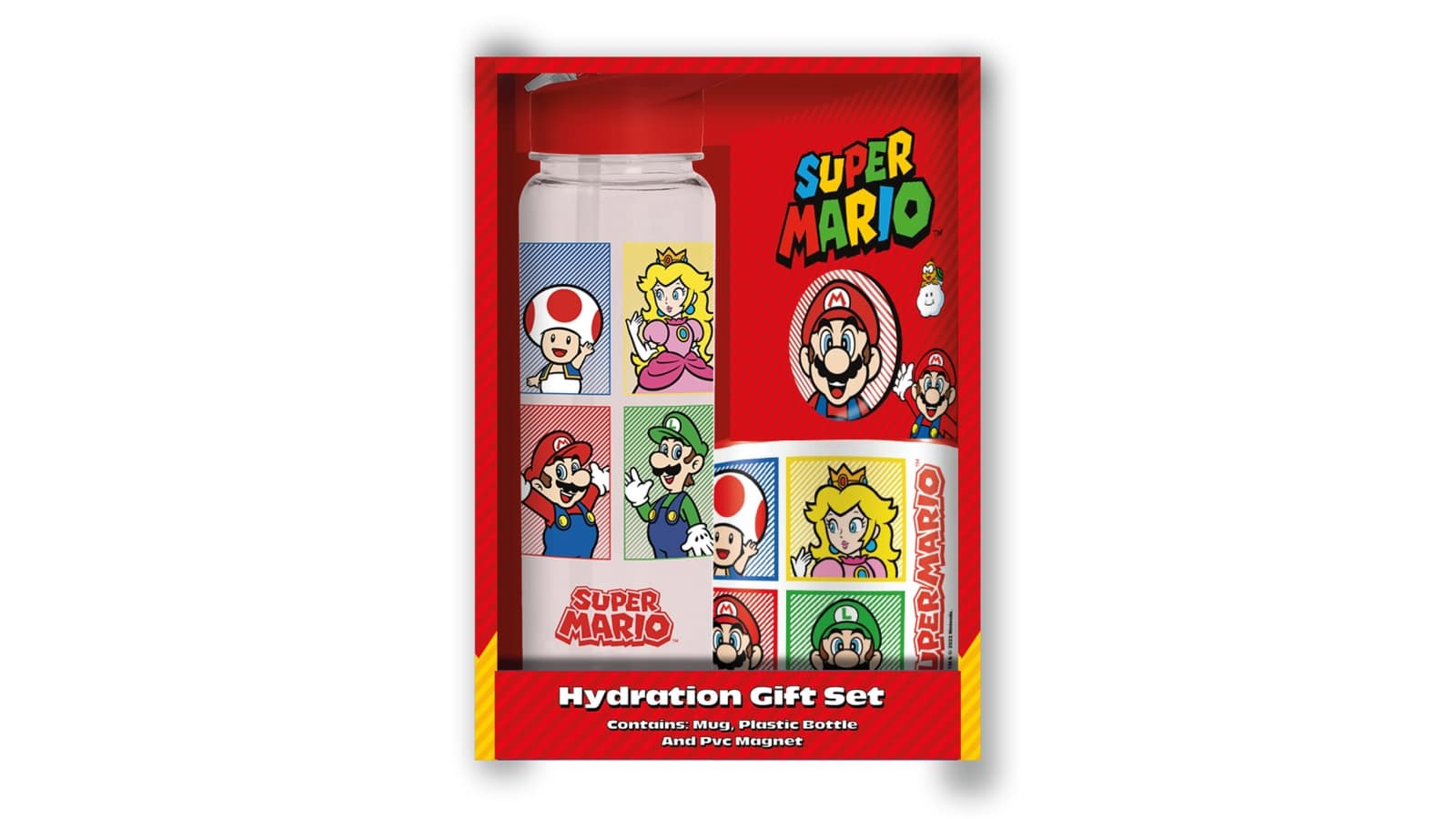 סט המתנה של Super Mario כולל ספל קרמי (320 מ”ל), בקבוק מים מפלסטיק (700 מ”ל) ומגנט – כולם בעיצוב צבעוני ומרשים!